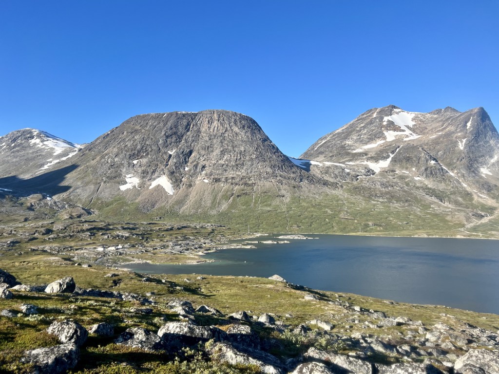 On the far side of the boulder field, we pick up the trail again and walk its sweeping arc around the shoreline of Qassi-Sø. Last winter, a violent storm blew away the dinghy GINR stashes on the lake, but, for the moment, the surface is sheltered and still, perfectly mirroring the two mountain peaks to the east, creating a sideways hourglass in the turquoise waters.
