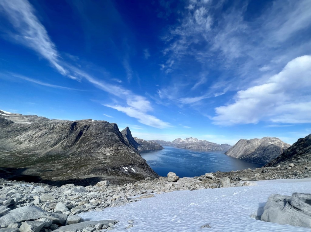 After an hour, I fasten our brimming sample bag around my chest, careful to keep all the samples upright to avoid leaking. Sitting on boulders to take off our crampons, Nicolas and I remark on the grandeur of the view. From our elevation, we see icebergs in the next fjord over and cliffs even greater than those in the Kobbefjord. My mind does mental gymnastics imagining all the hidden beauty bound by the mountain peaks in the thousands of fjords that line the coast of Greenland.
