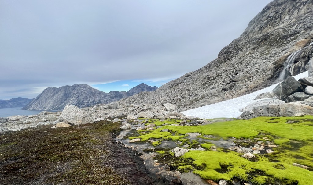 When we learn the boat will leave for Nuuk mid-afternoon, Nicolas and I plan one more short collection trip to a glacier south of the station to sample ice and snow algae. But Katrine warns that the route up to the glacier is prone to rockslides and suggests another glacier a few miles to the northeast. Earlier, we spied this glacier high up a mountain. Worried we will not have time to get to the glacier and back before the boat departs, we dash for the glacier and race up the winding path along the stream.